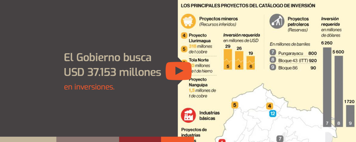 Aunque no serán presentados en el evento de mañana, Poveda dijo que espera inversiones por USD 2 000 millones en los proyectos privados de minería a gran escala. Para el caso del proyecto de cobre Mirador ya se ha invertido USD 100 millones este año y para el siguiente se espera otros 300 millones. En total, en la construcción de la mina a cielo abierto se espera una inversión de 1 200 millones de la firma china Ecuacorriente.